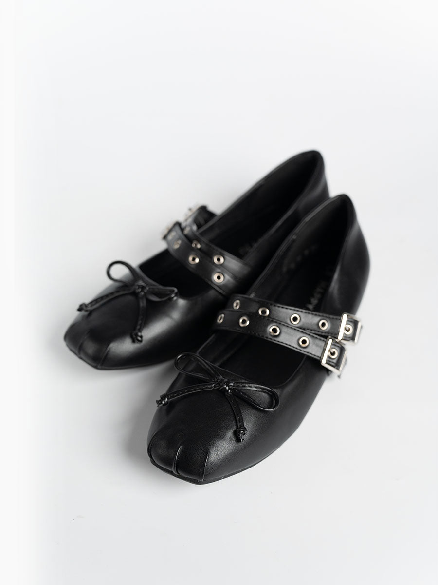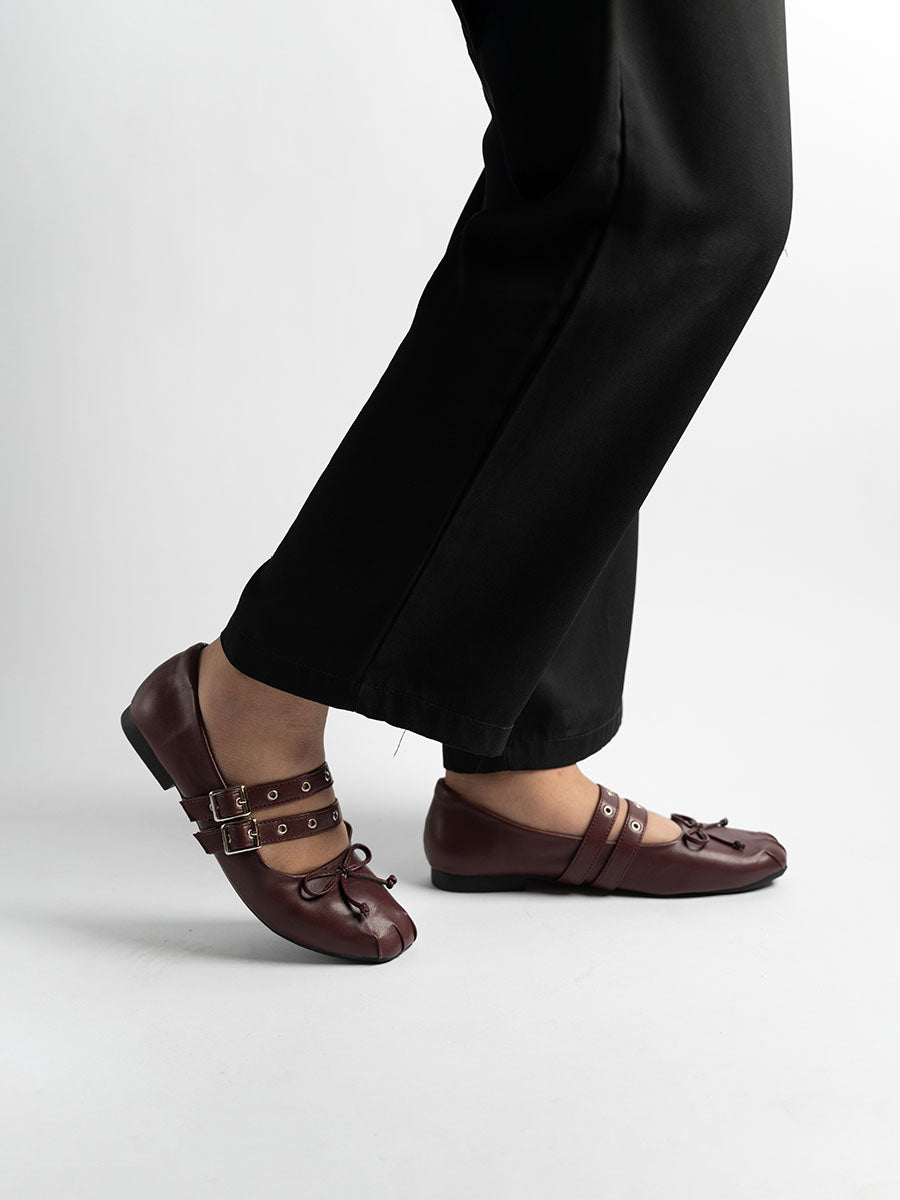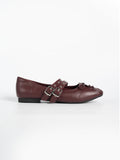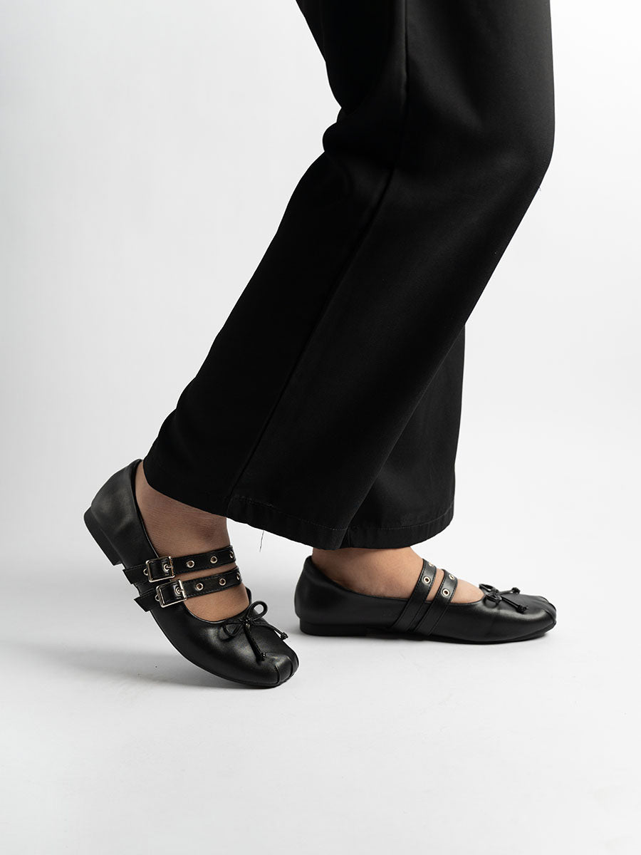 Make a statement with these eye-catching buckled Blake Double Strap Flats adorned with cute ribbon detailing that adds just the right touch of femininity. Crafted from soft leather, they offer a plush feel, while the adjustable eyelet strap ensures a secure and comfortable fit. The perfect blend of form and function, these flats redefine everyday sophistication with subtle artistry.