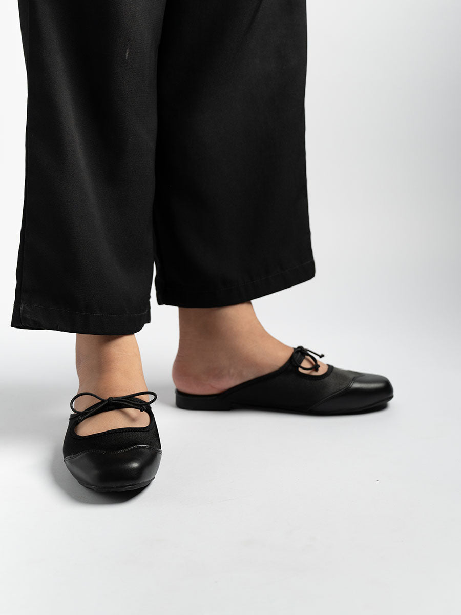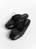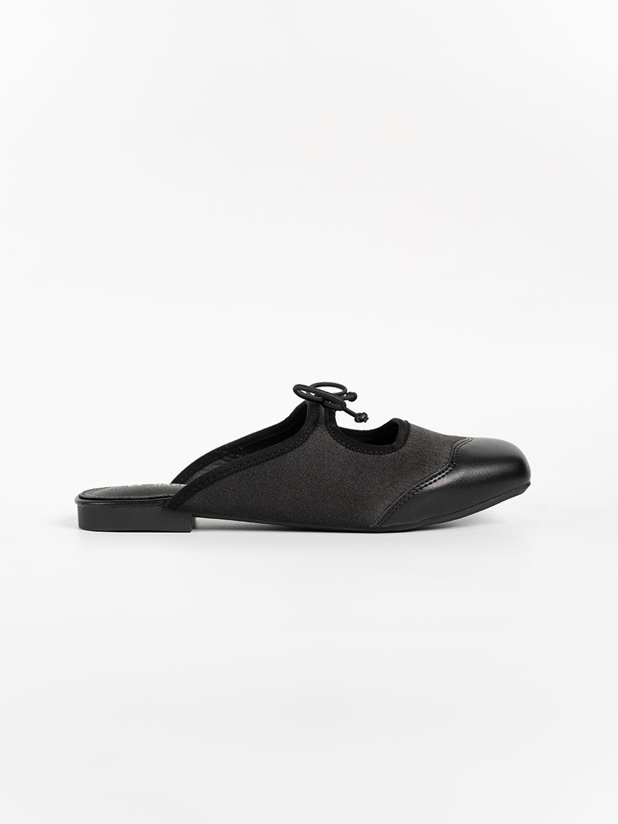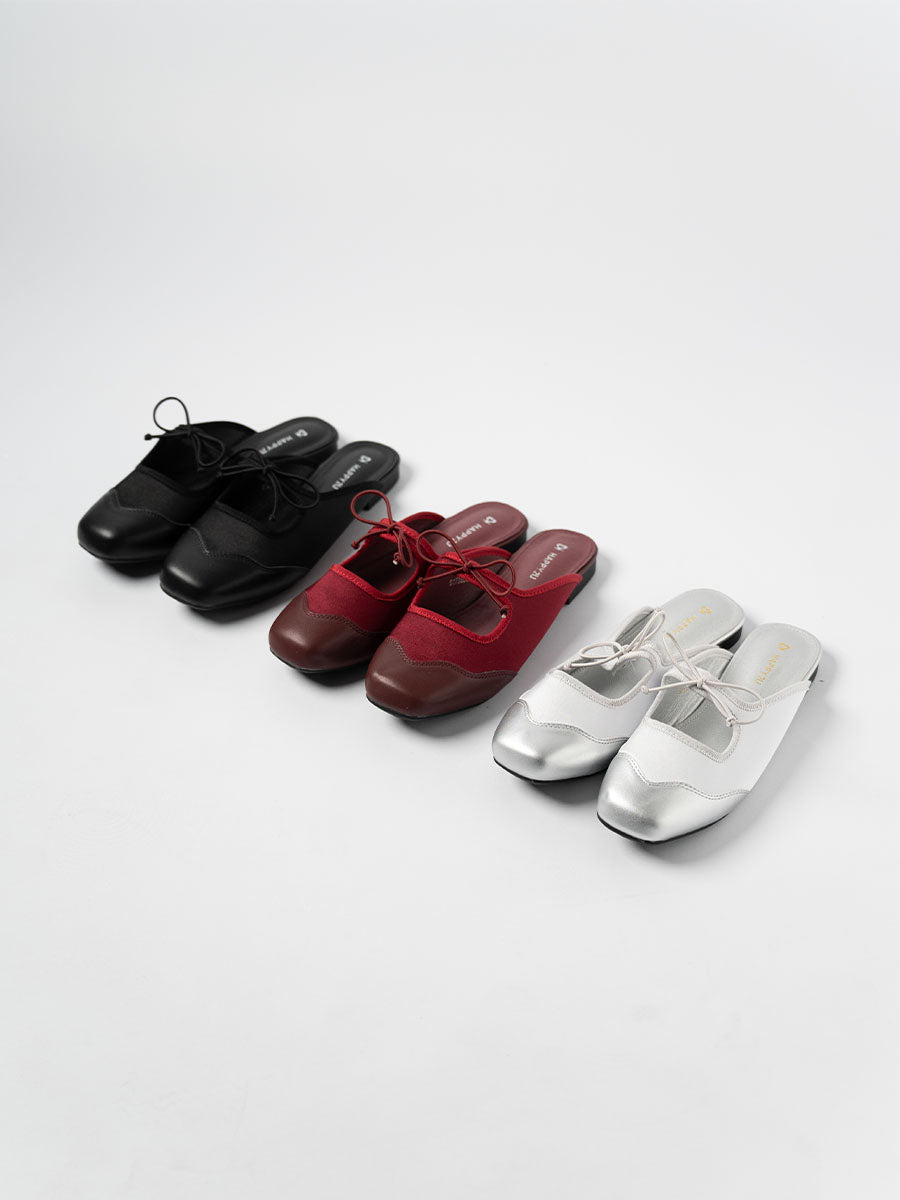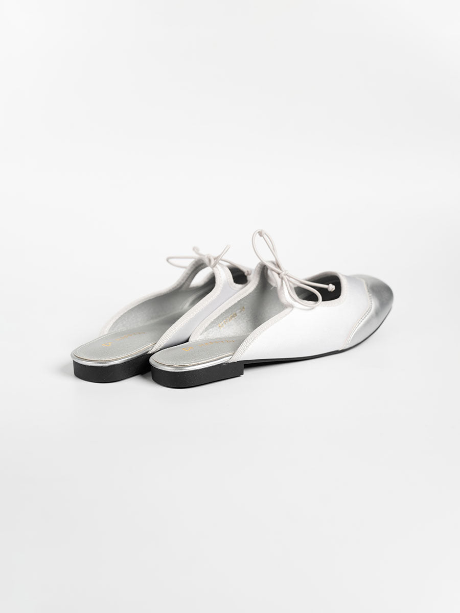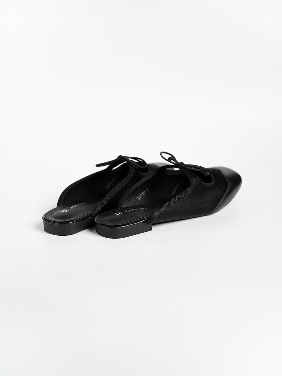 Crafted from soft satin and PU- leather, these luxurious Remy Ribbon Flats yet simple mules feature subtle stitching that highlights their refined design. It is also adorn with cute ribbon knots at the arch to complement the look. This pair offers an understated yet stylish finish perfect for both casual and polished outfits.
